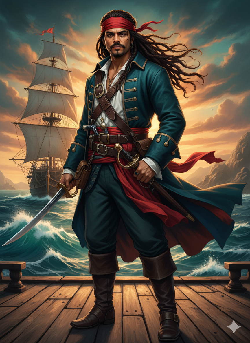 Create a 4K HD realistic pirate captain portrait maintaining the exact facial features, mustache, and beard from the reference image - no alteration, 100 percent same face.Character Details: Male pirate with long dark dreadlocks flowing in the wind, distinctive mustache and goatee, wearing a red bandana headband. His expression is confident and intense with a slight smirk.Clothing: Deep teal/dark blue pirate coat with ornate buttons and details, crossed leather belts with buckles across the chest, red sash around the waist, dark fitted pants, and tall leather boots. Multiple accessories including sword, pistol, and various pirate gear attached to belts.Pose: Standing confidently on wooden ship deck planks, one hand resting on sword hilt, body positioned at three-quarter angle facing slightly left, coat dramatically flowing.Background: Majestic tall ship with full sails billowing behind him, detailed rigging and masts. Dramatic ocean waves with turquoise and deep blue waters. Rocky coastline visible in the distance.Lighting: Epic sunset/golden hour lighting with warm amber and orange tones in the sky, dramatic clouds with teal and orange gradient. Strong directional lighting creating depth and shadows on the character and ship.Style: Cinematic, highly detailed digital art with rich colors and dramatic contrast. The overall mood is adventurous and heroic with that classic pirate fantasy aesthetic.